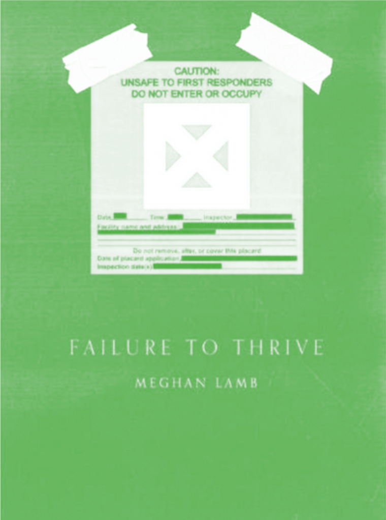 “The cover of Meghan Lamb’s Failure to Thrive features a red sign with a white X over it. Black text reads ‘CAUTION: UNSAFE TO FIRST RESPONDERS DO NOT ENTER OR OCCUPY.’ There’s a way to read this as titillation, as if the reader is being welcomed into something forbidden, but there’s another reading won out by the text itself: The lives the reader is about to dive into contain hazards.”